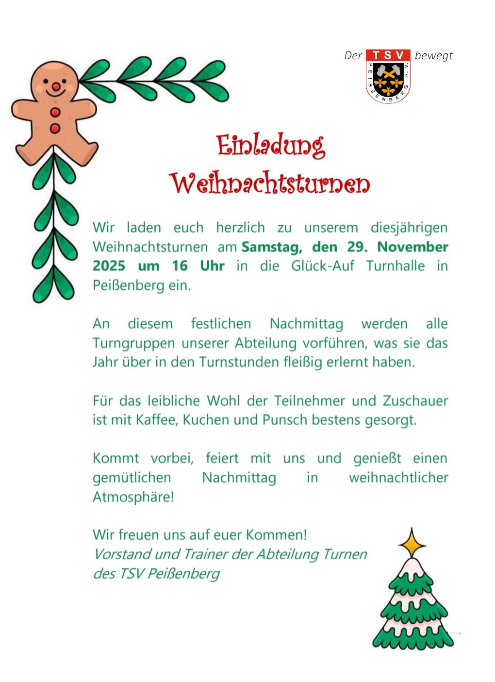 Angefangen bei den Eltern-Kind Gruppen (ab 2 Jahre) über Kinderturnen für verschiedene Altersgruppen, Wettkampfturnen, Fitnessgymnastik und Gesundheits- und Wirbelsäulen Gymnastik. Wir haben uns mehr dem Breitensport verschrieben, so dass wirklich jeder für seine Bedürfnisse das Richtige findet. Die entsprechenden Übungsstunden findet ihr unter dem Menüpunkt „Training“. Da unsere Gruppen sehr gut besucht sind, würden wir uns freuen, wenn ihr bei Interesse erstmal eine E-Mail an die Abteilungsleitung schreibt ( turnen@tsvpeissenberg.de). Da bekommt ihr dann Auskunft über freie Plätze, Probetraining oder die Warteliste.