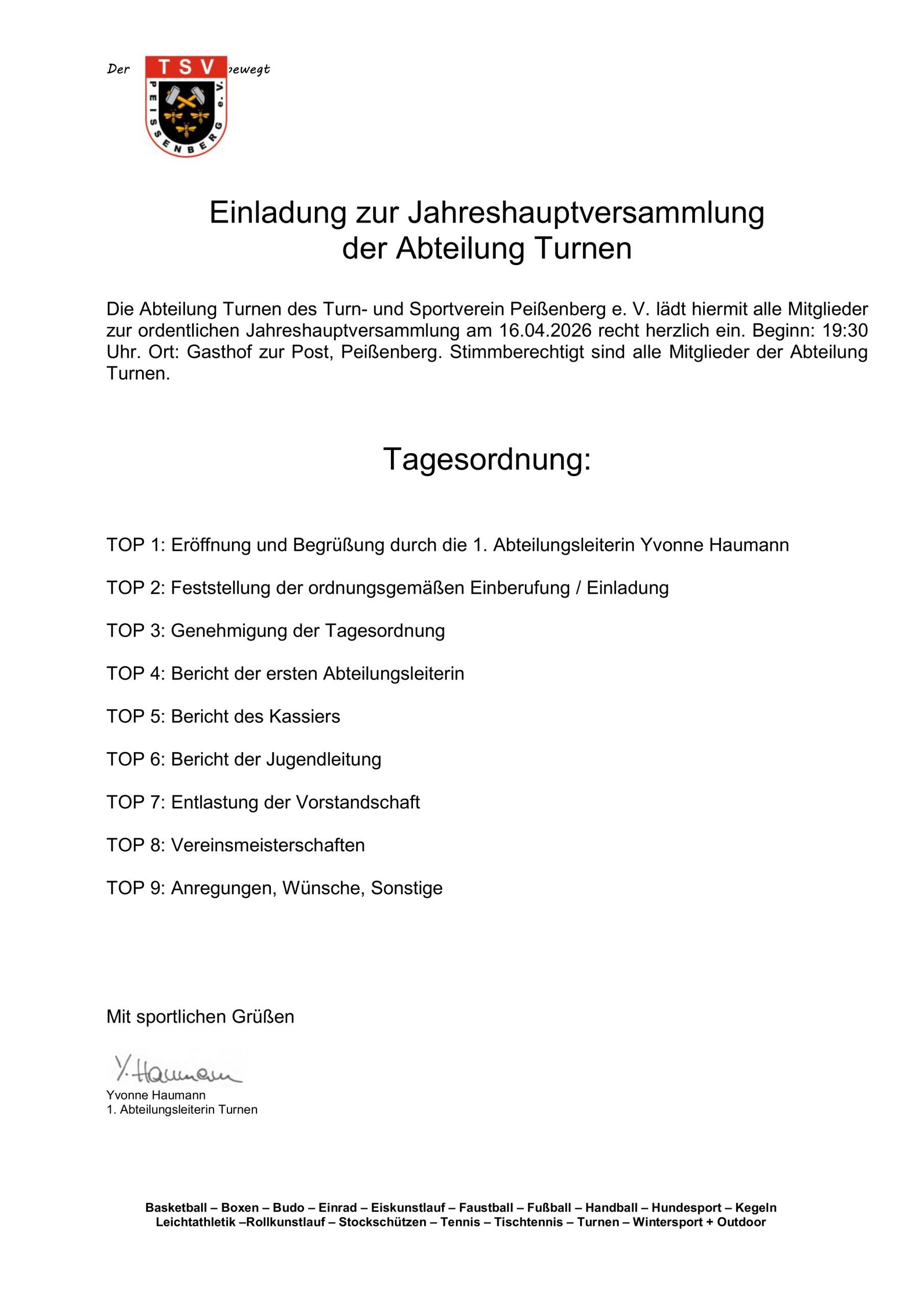 Die Jahreshauptversammlung findet am 16.04.2026 statt