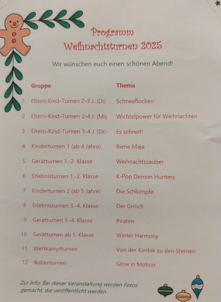 Am 29. November 2025 war es soweit: Um 16:00 Uhr begann unser festliches Weihnachtsturnen und sorgte über 2,5 Stunden lang für Begeisterung bei den Besuchern! Die Tribünen waren gut gefüllt, und wir durften etwa 800 Zuschauer begrüßen, die den Aufführungen folgten.