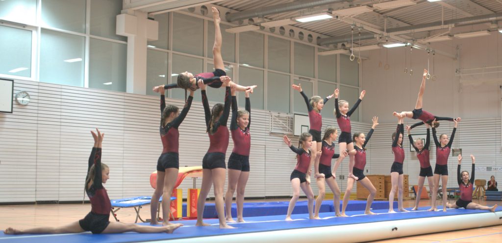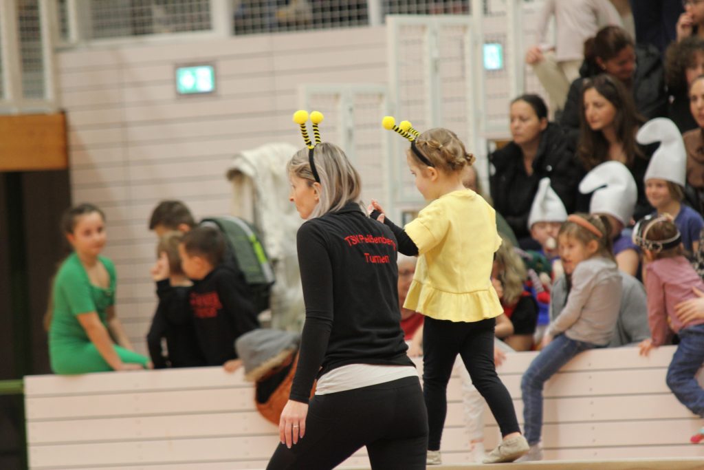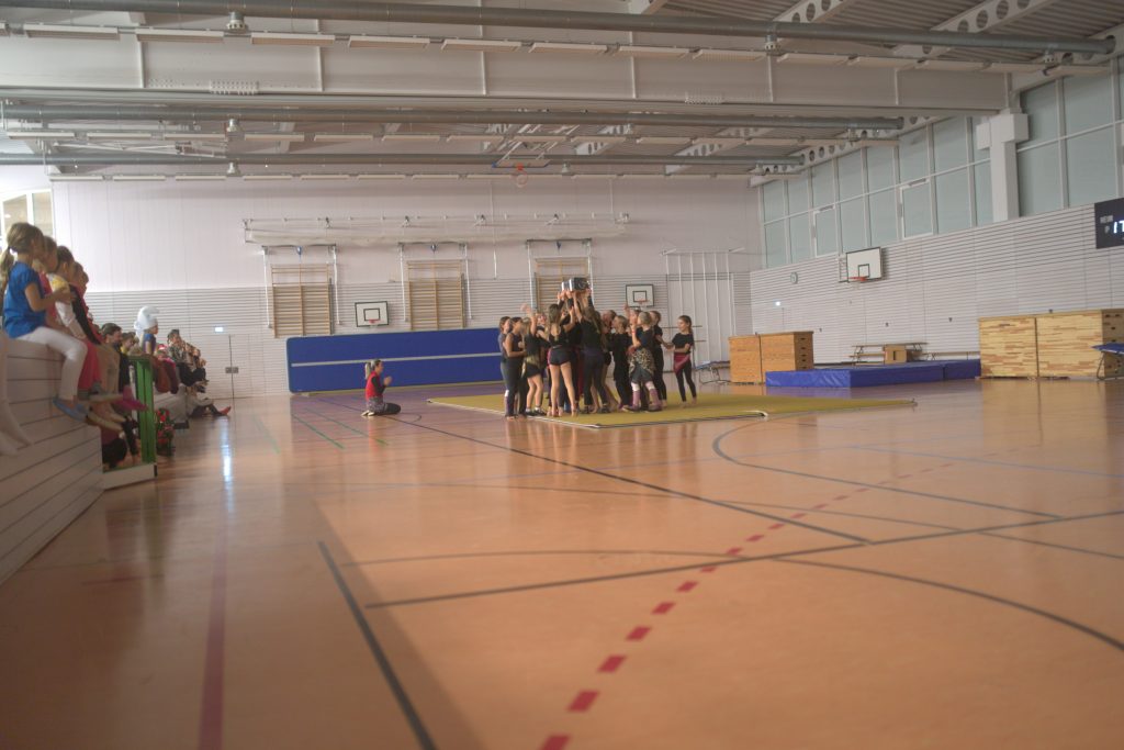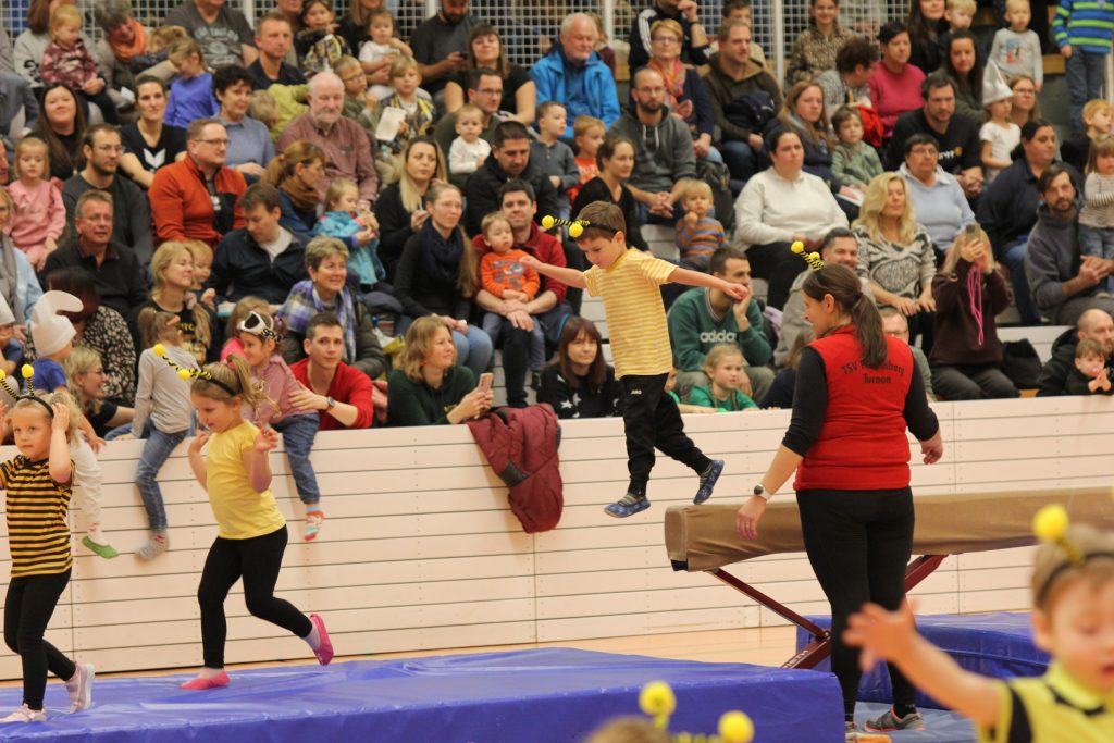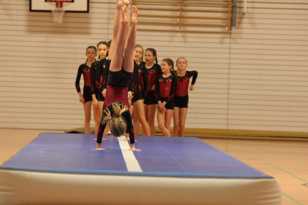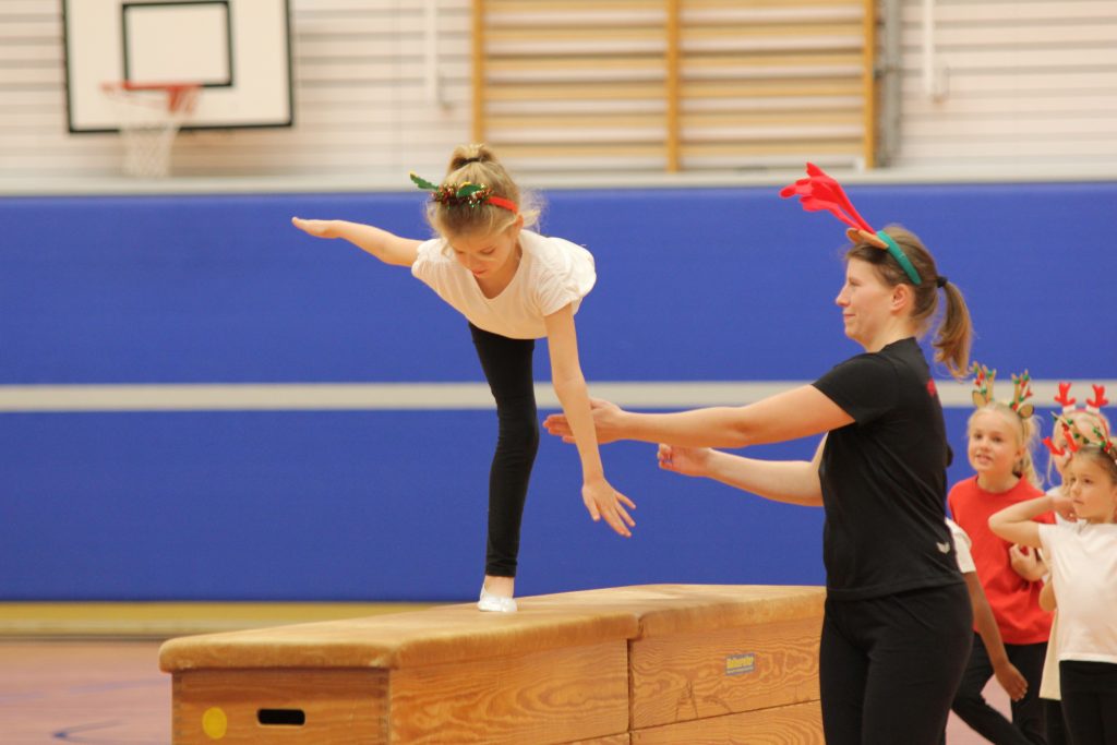 Insgesamt nahmen 280 Kinder im Alter von 2 bis 15 Jahren teil, die in den Wochen zuvor fleißig geübt und bestens vorbereitet für ihre Auftritte waren. Das abwechslungsreiche Programm begann mit unseren kleinen „Schneeflocken“ und „Wichteln“. Unsere Kindergartenkinder schlüpften in die Rollen von Biene Maja und den Schlümpfen und zeigten an verschiedenen Stationen erste turnerische Elemente. Kreativer wurde es bei den Turngruppen der Grundschulkinder, die mit ihren Tanzchoreografien begeistern konnten, und anschließend mit viel Spaß und Energie am Boden, Sprung und Trampolin ihr Können zeigten. Für die festliche Stimmung an diesem Nachmittag sorgten Programmpunkte wie „Winter Harmony“ und „Weihnachtszauber“. Bei unserer Wettkampfgruppe konnten die Zuschauer schwierige Turnelemente am Sprungtisch und auf der Airtrack bestaunen. Mit Flick Flacks und Saltos ging es von der Karibik bis zu den Sternen. Den Abschluss bildete unsere Bubengruppe mit ihrer Vorführung im Dunkeln mit Leuchtstreifen. Mit viel Power konnten sie das Publikum am Ende nochmal mitreißen.