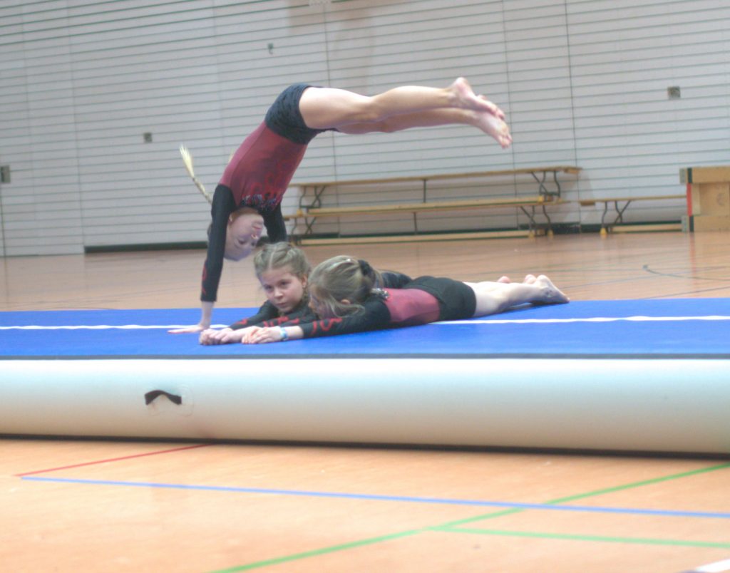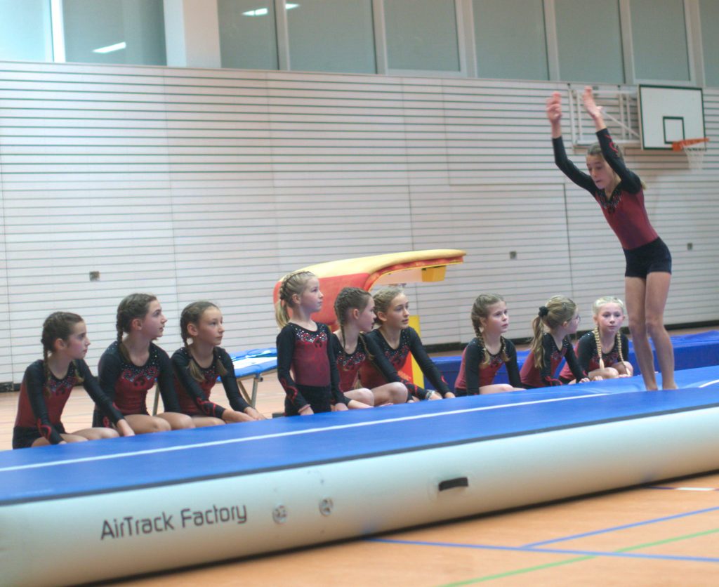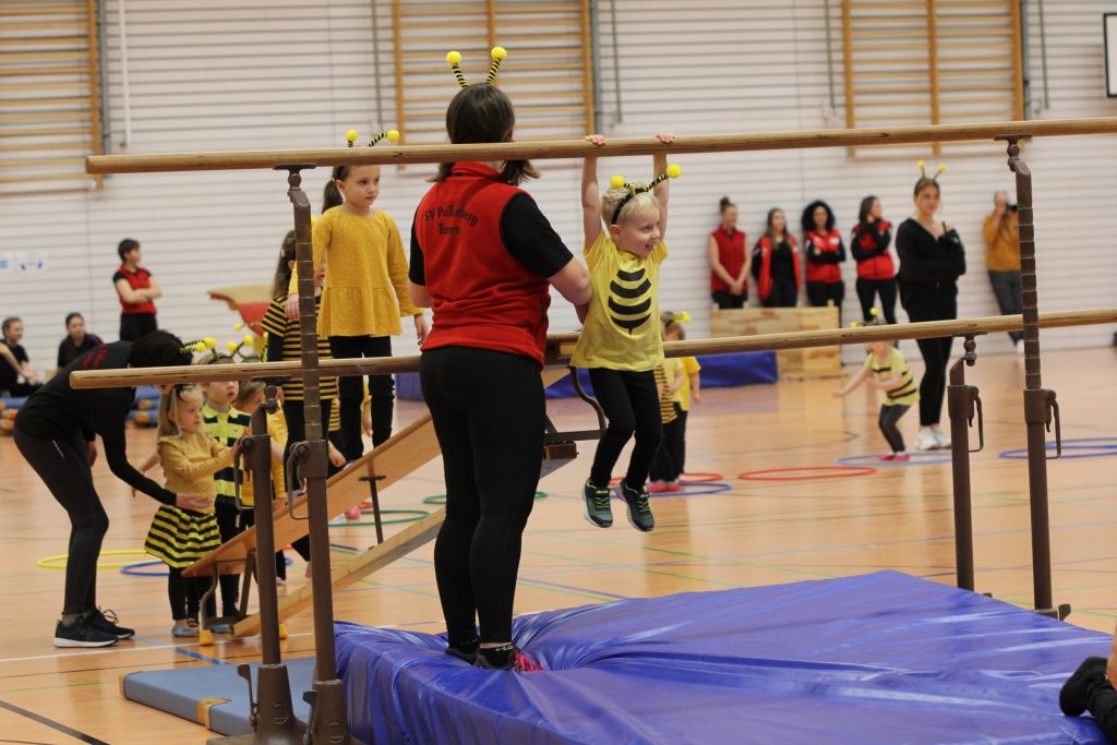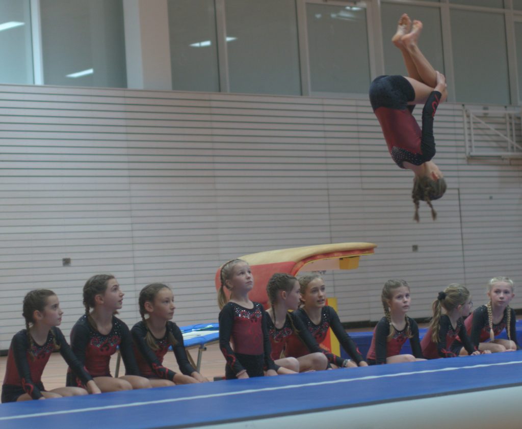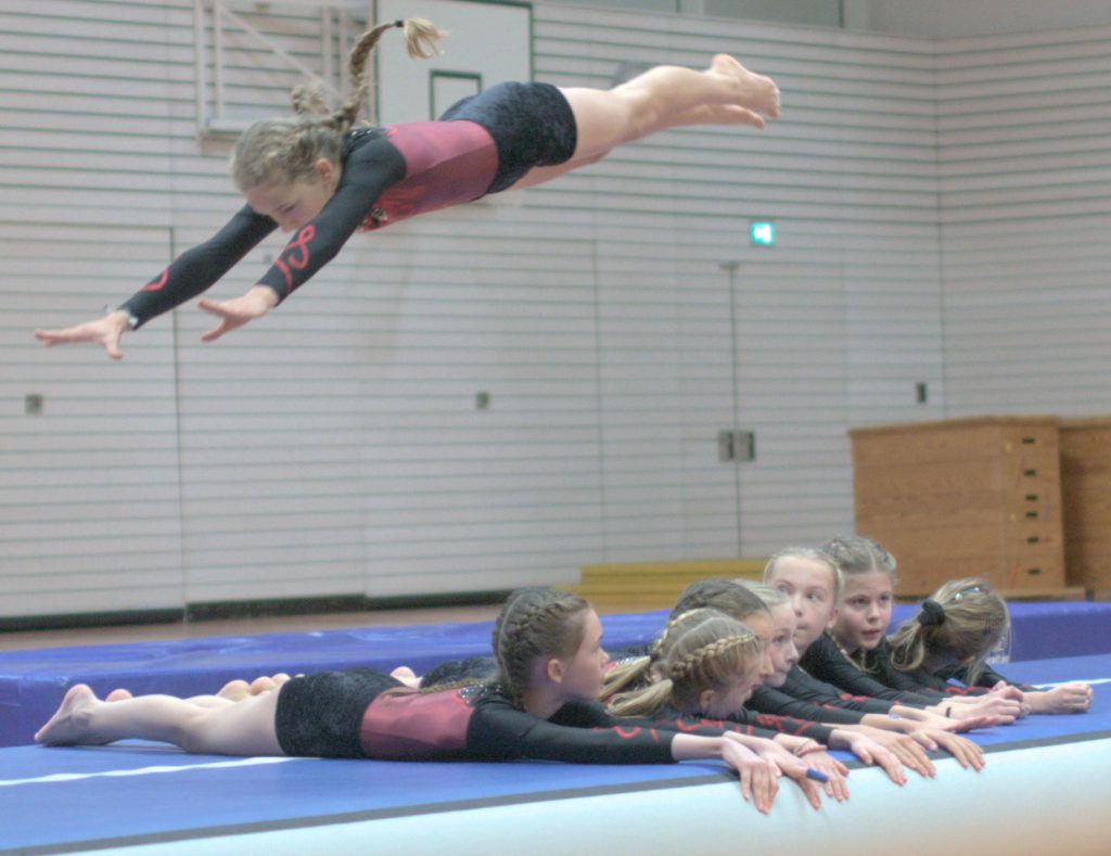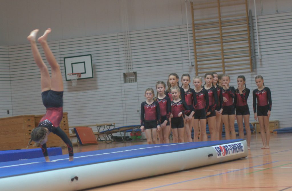 Insgesamt nahmen 280 Kinder im Alter von 2 bis 15 Jahren teil, die in den Wochen zuvor fleißig geübt und bestens vorbereitet für ihre Auftritte waren. Das abwechslungsreiche Programm begann mit unseren kleinen „Schneeflocken“ und „Wichteln“. Unsere Kindergartenkinder schlüpften in die Rollen von Biene Maja und den Schlümpfen und zeigten an verschiedenen Stationen erste turnerische Elemente. Kreativer wurde es bei den Turngruppen der Grundschulkinder, die mit ihren Tanzchoreografien begeistern konnten, und anschließend mit viel Spaß und Energie am Boden, Sprung und Trampolin ihr Können zeigten. Für die festliche Stimmung an diesem Nachmittag sorgten Programmpunkte wie „Winter Harmony“ und „Weihnachtszauber“. Bei unserer Wettkampfgruppe konnten die Zuschauer schwierige Turnelemente am Sprungtisch und auf der Airtrack bestaunen. Mit Flick Flacks und Saltos ging es von der Karibik bis zu den Sternen. Den Abschluss bildete unsere Bubengruppe mit ihrer Vorführung im Dunkeln mit Leuchtstreifen. Mit viel Power konnten sie das Publikum am Ende nochmal mitreißen.